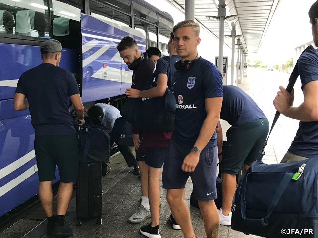 関西国際空港から兵庫県内のホテルに移動したイングランド代表。長時間移動による選手の疲労と現地の大雨によりトレーニングはキャンセルとなりましたが、チームミーティングを行い、土日の試合に向けた準備を進めています。