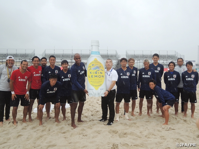 ビーチサッカー日本代表は7月6日(金)、兵庫県明石市大蔵海岸公園で5日目のトレーニングを実施。トレーニング前には、日本代表オフィシャルパートナーであるキリングループより、代表者からのビーチサッカー日本代表への激励とともに飲料の贈呈が行われました。
