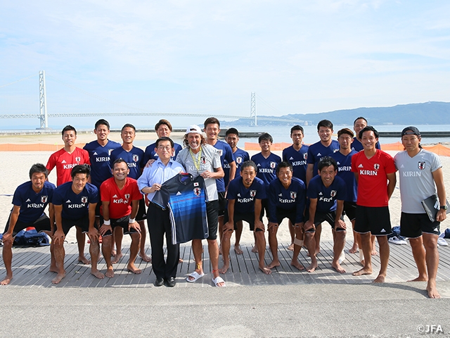 ホテル集合後に昼食をとり、早速会場である大蔵海岸公園に移動してトレーニングを実施しました。トレーニングの冒頭に明石市の泉房穂市長が会場を訪れ、代表チームに心のこもった力強いメッセージを送りました。