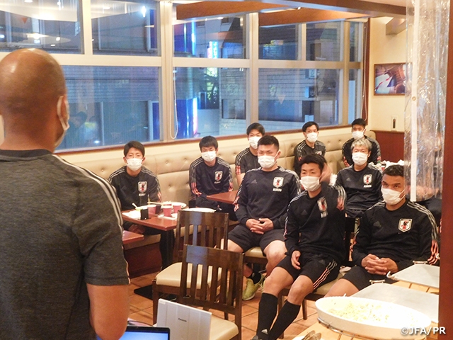 夜には、ミーティングを行い、守備時のマーク受け渡しの考え方やリード時のボールの回し方を前回のトレーニングマッチの映像を見ながら振り返り、翌日からのトレーニングの意識付けをして合宿初日を終えました。