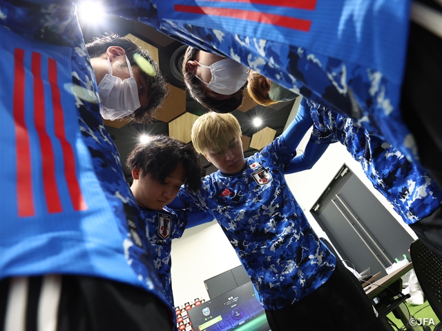 選手全員で試合前に円陣を組み、気持ちを入れ替えたe日本代表は前半に先制点を奪います。前半に主導権を握ったe日本代表は、後半も攻勢で試合を進め、試合終了間際のアディショナルタイムに大きな追加点を奪い、2-0で終了の笛を聞きました。