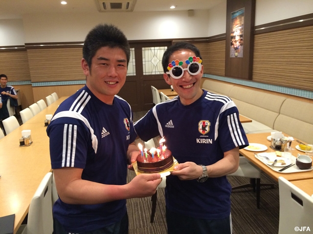そしてこの日は選手たちの兄貴分であり、そしてチームのムードメーカーでもあるコーチ兼通訳の小森さんの誕生日。ケーキ、そしてご自身で持ち込んできた派手なメガネでお祝いしました。