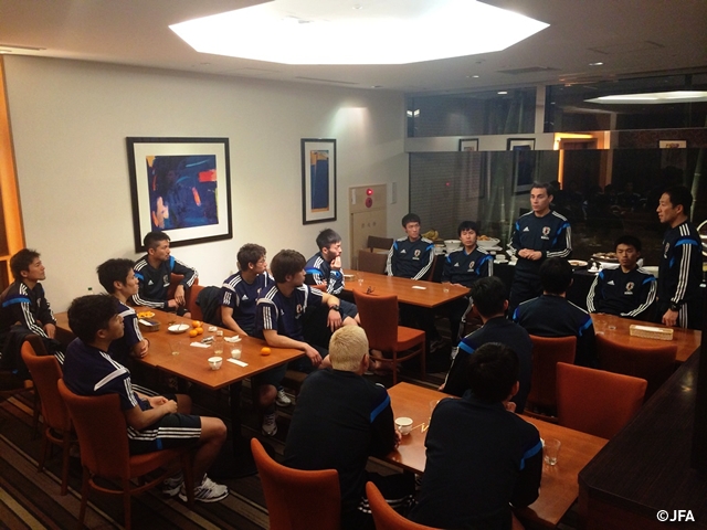 夕食後、選手たちが談笑しているところにミゲル監督が話をはじめました。「クロアチアはモダンな戦術を取り入れてヨーロッパ選手権でも強豪チームを苦しめた力のあるチーム。しかし臆することなく日本らしく戦おう。日本のサポーターやファン、家族や友人にアジア王者のプレーを観てもらうことができる機会。AFC選手権の決勝で見せたパフォーマンスをスタンダードにしていかなければいけないし、そこに上積みを重ねていかなければいけない。」と、選手たちに来るクロアチア戦へモチベーションの上がる言葉を投げかけていました。