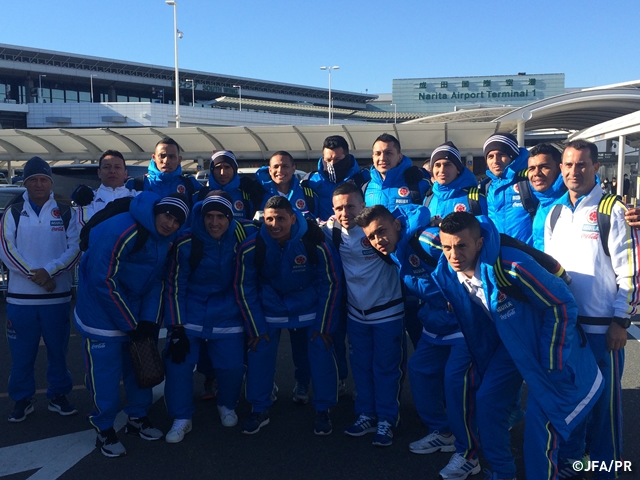フットサルコロンビア代表が1月25日(月)、27日(水)に東京、30日(土)に大阪で開催されるフットサル日本代表との国際親善試合のため来日しました。成田空港に到着したチームは長旅の疲れを見せつつも、和やかな雰囲気の中、この日はホテルで休養を取り、練習は行わず、第1試合の会場となる国立代々木競技場第一体育館を下見しました。