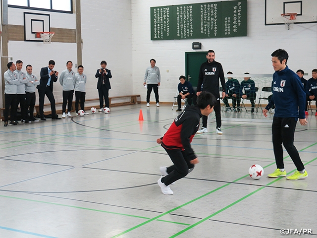 フットサル日本代表は10月26日(金)、Castello Dusseldorfにてフットサルドイツ代表との国際親善試合第2戦を行いました。試合前日の25日(木)にはデュッセルドルフ日本人学校を訪問し、81名の中学生を対象に約1時間、フットサルを通して触れ合うことができました。ここに参加した多くの子どもたちが試合観戦に訪れ、選手たちを応戦してくれました。