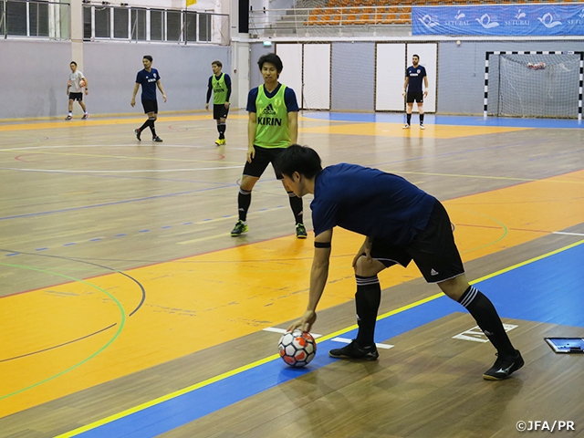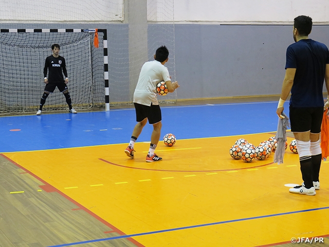 翌28日(日)よりトレーニングを開始し、この日からSLベンフィカ(ポルトガル)でプレーする逸見勝利ラファエル選手と、エルポソ・ムルシアFS(スペイン)でプレーする清水和也選手がチームに合流し、全16名が揃いました。トレーニングは午前、午後の2部構成で行われ、チーム全体の雰囲気も良く、強度と集中力を持ってトレーニングに臨んでいました。遅れて合流した逸見選手、清水選手の両名も、これまでの戦術を理解しようと、積極的なコミュニケーションが見られました。午後にはGKトレーニングも行われ、ポジション別での強化・調整を行い、強豪ポルトガル代表との一戦に向けて準備を進めました。