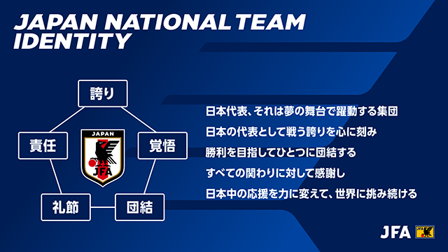 日本代表が、オンザピッチだけでなく、オフザピッチでも世界に称賛されるチームとなれるよう、このアイデンティティを、日本代表のエムブレムを付けて戦う選手、ナショナルコーチングスタッフ、チームスタッフ全てに浸透させていきたいと考えています。