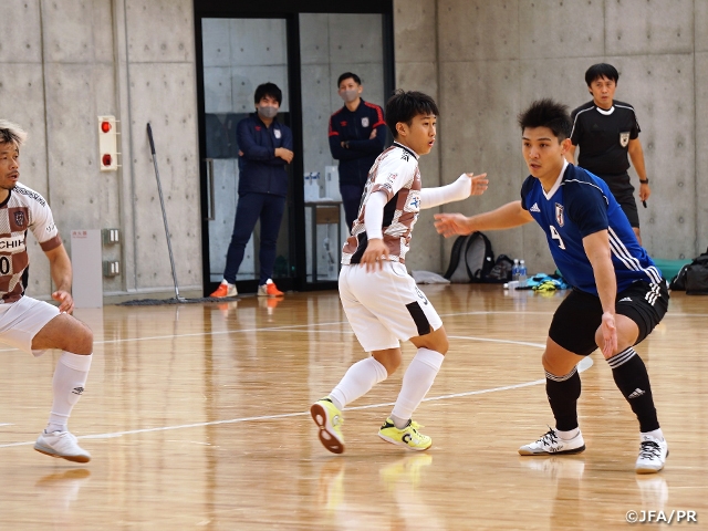 トレーニングマッチはプレーイングタイム方式の1ピリオド20分2本で実施されました。第1ピリオド、相手チームに積極的に攻め込む日本代表候補チームでしたが相手の守備やGKの好セーブでなかなか得点が奪えませんでしたが、9分に仁部屋和弘選手が待望の先制点を奪います。その後は互いが攻撃を仕掛け合い、得点が生まれない緊張感の溢れる時間が続きますが、17分に皆本晃選手、18分に平田ネトアントニオマサノリ選手のゴールが立て続けに決まり、第1ピリオドを3-0で折り返します。第2ピリオドは日本代表のコンセプトである強度の高い守備で相手の攻撃の芽を摘んでいき、相手を圧倒する時間が増えていきます。23分に2度目の代表候補招集となった水谷颯真選手が味方の浮き球のパスを豪快にボレーで決めて追加点を奪うと、そこから立て続けに室田祐希選手、内田隼太選手、平田選手の複数得点が決まり、最終スコア8-1でトレーニングマッチを終えました。