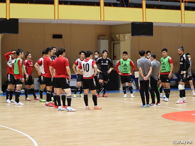 9月1日(水)にスペインでの活動を終えたフットサル日本代表は、翌2日(木)に空路と陸路でワールドカップ開催国のリトアニアに移動。日付が変わった深夜の到着だったため、3日(金)のトレーニング初日はレクリーエーションメニューを中心にした軽めの調整に留めると、4日(土)、5日(日)と徐々に負荷を高めてトレーニングを再開させました。完成度を高めるためにトレーニング前に映像を使ったミーティングを行い、全員が細部に渡るコンセプトを共有・イメージした上でトレーニングに臨みます。攻守の両局面はもちろんのこと、フットサルの特徴的な戦術であるパワープレーや、キックイン、セットプレーまで、試合を想定した高い強度を再現しながら確認を続けていきます。