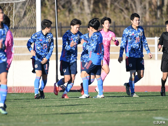 試合は両チームが流れを掴むべく探り合いながらスタートし、決定機はないものの緊張感ある立ち上がりを見せます。最初にチャンスを掴んだのは日本。16分、前線で鋭い攻守の切り替えからボールを奪い、FW千葉寛汰からパスを受け、この試合何度も積極的にオーバーラップを仕掛けたDF松田隼風選手がクロスを上げると、相手DFとGKに防がれます。28分にも、左サイドを崩し、松田選手のクロスをFW真家英嵩選手がトラップから素早く打ちますが、相手DFの体を張ったDFに防がれ、惜しくもチャンスを逃します。試合前に船越優蔵監督から「まずこの試合を勝って、タイトルを取ろう」と送りだされていたチームは、その後も攻守の切り替え、選手間の距離、リスク管理など、コミュニケーションを活溌にし、相手に流れを渡しません。そして41分、先制点が生まれます。DF菊地脩太選手のパスを受けたMF安部大晴選手が、前線へふわりとスルーパスを送ると、千葉選手が上手く体を反転させ、GKと接触も、意地でゴール右隅へゆっくりねじ込みます。前半はそのまま1-0で終了します。