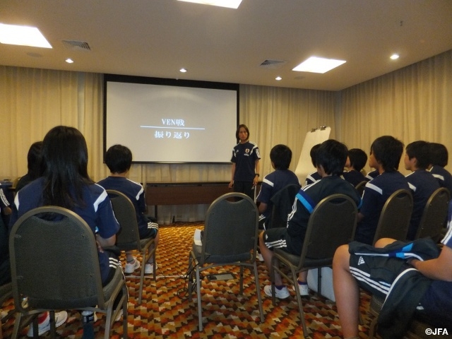 午後はミーティングを行いました。高倉監督は「みんなで結果をつかみとったベネズエラ戦。しっかり振り返って、次はもっと良いゲームをしよう。さらに集中力を高めて、決勝戦ではスペインのサッカーをさせない、常に日本のサッカーができるようにしよう」「世界一を取るチャンス。ゲームに向けて気持ちを高めて、みんなで決勝戦に向かおう!」と語り、選手たちは真剣な表情で頷いていました。