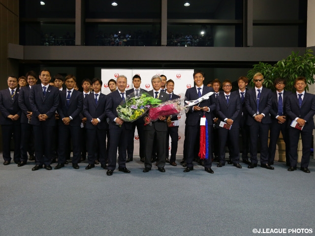 アルベルト・ザッケローニ監督以下、大会メンバー23人、トレーニングパートナー2人、コーチングスタッフらの選手団は、夜間の出発にも関わらず空港に駆け付けた数百人のファンの「ニッポン」コールの声援を受けての旅立ちとなりました。