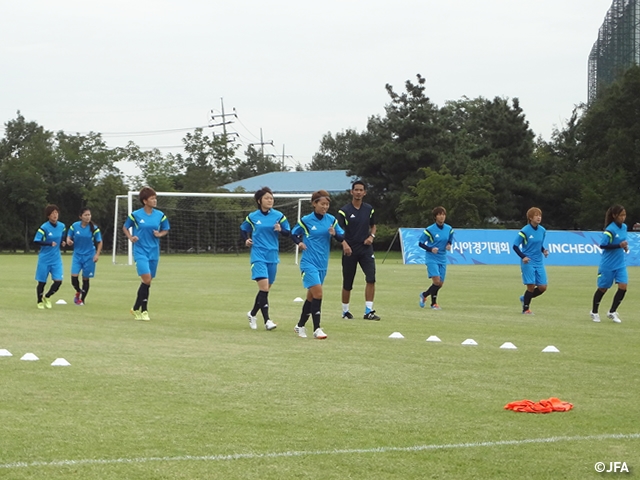 第17回アジア競技大会の初戦・中国戦に引き分けたなでしこジャパンは17日(水)、第2戦・ヨルダン女子代表戦を翌日に控え、仁川近郊で最終調整を行いました。
