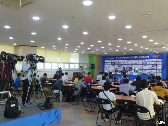 28日(日)に開催される、第17回アジア競技大会 サッカー男子 準々決勝 対 U-23韓国代表戦を翌日に控えた27日(土)午前、日韓両チーム監督出席の記者会見が試合会場である文鶴スタジアムで行われました。
