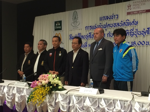 午後には、タイサッカー協会主催の記者会見が行われました。手倉森誠監督が、タイ協会の招待に対する感謝の言葉と、試合への意気込みを大勢集まった地元メディアに対し熱く語りました。記者会見には、タイサッカー協会のウォラウィ・マクディ会長も出席し、この試合の注目度の高さが伺えました。