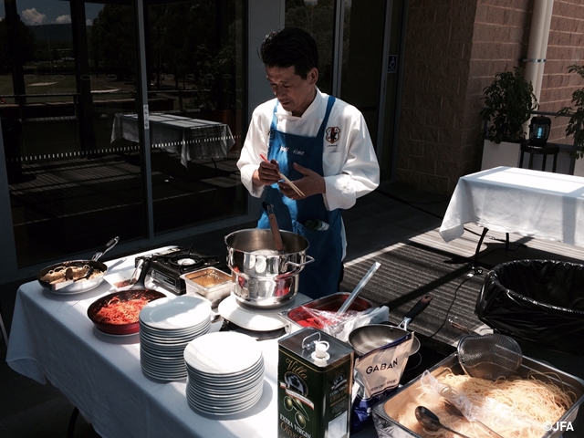 幾多の国際大会を知る専属シェフの西芳照さんです。昼食から早速ライブクッキングで食事をサポートしてくれています。西さんの作ってくれた料理を食べ、食事会場は笑顔と活気が溢れていました。