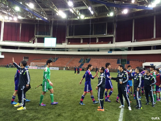 後半に入っても日本は攻め続けますが、徐々に疲れのせいからかミスが目立ち始め、不用意なパスミスからボールを奪われて相手にシュートを打たれる場面を作ってしまいます。そして、ボールを奪ってもボールの受け方、ポジショニングなどちょっとした動きができなくなり、前半のようにボールを動かすことができません。それでも途中交代で出場した選手が積極的に動いてチャンスをつくり、左サイドからクロスボールがゴール前に入りますが、相手の粘り強い守備に阻まれ、試合はそのまま0-0で終了。