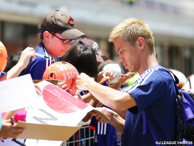 この日の練習にはブリスベン日本人会の子どもたち約60人が訪れ、練習前にアギーレ監督がチームを代表して花束と応援メッセージの寄せ書きの入った日本国旗を受け取り、チームと一緒に記念撮影をしました。