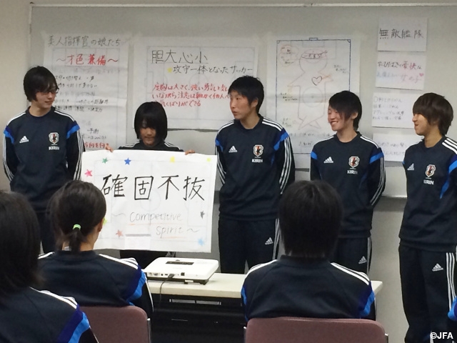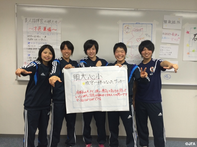 夜のミーティングでは、キャンプ2日目から5人1組のチームで考えているチームコンセプトを発表しました。5つ挙げられたチームコンセプトから、多数決により清家貴子選手、市瀬菜々選手、杉田妃和選手、三浦成美選手、北川ひかる選手の5人が考えた「胆大心小」に決まりました。「胆大心小」は、度胸は大きく、強い勇気と気力を持っていながら注意深く他の人への思いやりや気配りができることを意味します。チームが一丸となり、ピッチの外でも中でも「胆大心小」をスローガンに、来年行われるFIFA U-20女子ワールドカップの出場権獲得を目指します。
