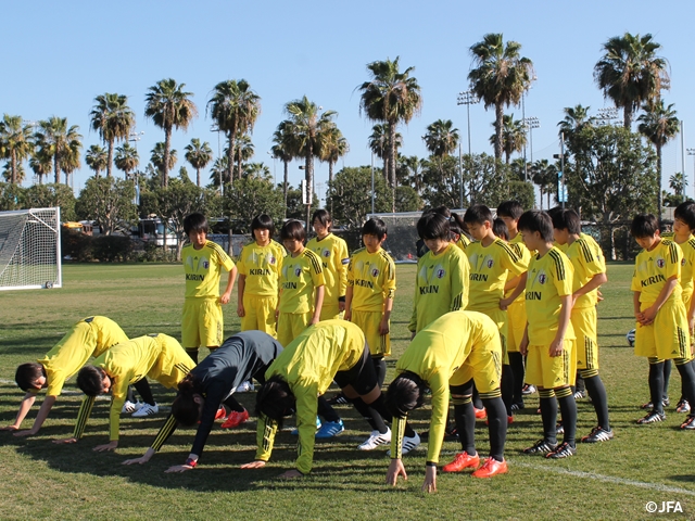 今月就任が発表されたばかりの楠瀬直木監督を迎え、U-16日本女子代表が立ち上げるとなる第1回目の活動を開始しました。アメリカで開催される「2015 U-17女子NTC招待大会」に参加するため、チームは8日(日)に成田空港に集合しました。「日本代表のウェアに袖を通した瞬間から、君たちは代表選手なのだ」と楠瀬監督から気の引き締まる言葉を受け、選手・スタッフとも元気にアメリカ入りしました。 午前中に現地に到着し、カリフォルニアの強い日差しの中で15時から早速トレーニングを開始。、山口アスレティックトレーナーの説明を受けながら、長時間の移動で固まった身体を動的ストレッチや体幹などでほぐします。