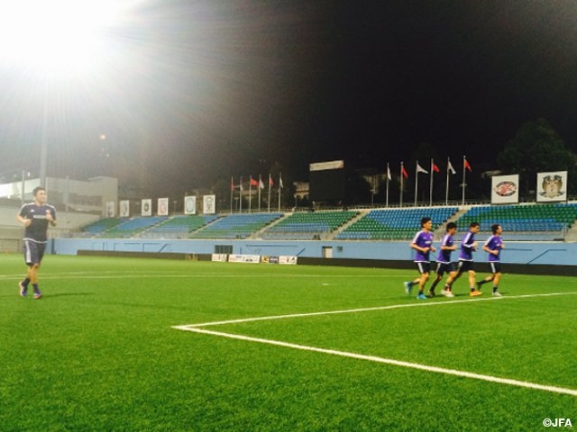 11日夕方、都内に集合した選手たちに手倉森監督は、12月のタイ・バングラデシュ遠征に引き続き、今回も「暑熱順化」を遠征の目的に掲げました。12日には午前のフライトで羽田空港よりシンガポールへ発ちました。これまでは移動の際に、機材故障など何かとトラブルの多いチームでしたが、今回は予定通り無事遠征先へ到着することができました。シンガポールに着いた後、早速、試合会場であるジャラン・ベサールスタジアムで一回目の練習を行いました。多少湿度が高いものの、それほど気温が高くない環境で、エアロビック・トレーニングを中心とした約1時間の練習を行い、選手たちは「暑熱順化」に向けてしっかり汗を流しました。