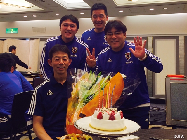 夕方からは合宿一回目の練習を実施。練習前には日本代表オフィシャルスポンサーであるキリングループより、激励および飲料の贈呈式が行われました。気温が低く雨が強く降る中での練習となりましたが、週末Jリーグの試合に出場した選手たちはリカバリー中心のメニューをこなし、それ以外の選手はボールテクニックや3+3対3のポゼッション練習等、約1時間しっかり体を動かしました。夕食時には、早川コンディショニングコーチの誕生日を皆で祝い、合宿初日を終えました。
