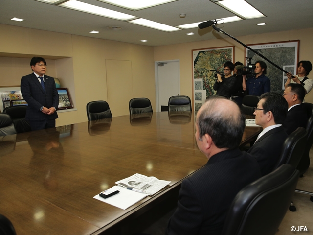 市原市役所には報道陣が多数集まり、終始なごやかな雰囲気の会談に。手倉森監督から4年前の佐久間市長のご厚意に対し感謝の意を伝えると、市長からは「サッカーは社会に通じるスポーツ、サッカーを通じて子供たちを一層元気にして欲しい」と温かい激励のお言葉をいただきました。