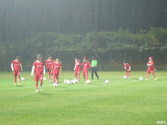 昨日は、夜行便のフライトで早朝の到着となったため、選手たちは少し疲れた様子を見せていましたが、夕方には寒空の雨の中、1時間弱の軽めのトレーニングをこなし、試合に備えました。