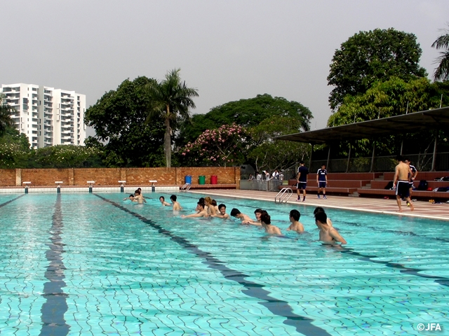 前日まで猛暑の中2日連続で2部練習を敢行したチームは、この日も朝から気温33.5℃、湿度61%と厳しい気候でしたが、暑熱順化も兼ねたリカバリーを中心としたメニューをこなしました。前半はサッカーテニスで楽しく汗を流し、後半は学校内のプールでリカバリートレーニング。選手たちは次の練習に向けて、リラックスした表情でコンディションを整えていました。