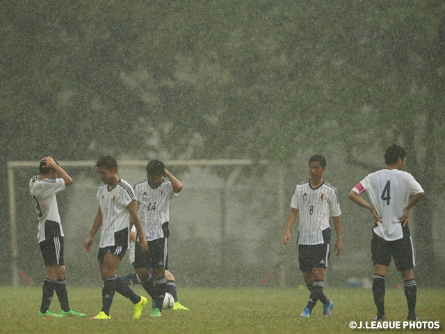 前半の終盤からスコールに見舞われため、辺りは薄暗く、ピッチ上に水たまりができ始めた中で迎えた後半。日本は大幅に選手を入れ替えます。DFは山中亮輔選手・奈良竜樹選手・岩波拓也選手・安在和樹選手、ボランチに原川力選手・野津田岳人選手、2列目には豊川雄太選手・中島翔哉選手・矢島慎也選手、1トップには浅野拓磨選手の各選手が入りました。4-2-3-1と布陣を変えた日本ですが、さらに強まる雨脚の影響もあり、ゲームコントロールに苦戦する場面も。雷鳴も轟く荒天の中、終了間際の59分、60分と浅野選手が立て続けにゴールをあげ、試合はそのまま5-0で終了しました。