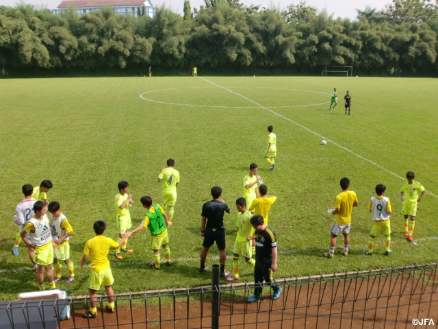 U-15日本代表インドネシア遠征最終日は、ボゴール州の高校生チームU-18 PPLPD school of athleticとトレーニングマッチ(30分x3ゲーム)を行いました。昨日の試合同様、日本は1本目から激しいプレスで相手を圧倒し、5分に棚橋尭士選手が中盤との見事な連携で幸先良く先制点をあげます。9分には右サイドでボールを受けた宮代大聖選手が見事なロングシュートを決めて2点目。ベンチからのサブメンバーのサポートの声も良く、水分補給のタイミングや球際などでスタメンの選手を盛り上げていきます。攻勢が続く日本は23分、棚橋尭士選手が抜けだして3点目。2本目は少し疲れが出てきた日本に対し相手も攻め込みますが、福島隼斗選手のゴール前での体を張ったプレーなどで得点を許しません。3本目、予測したインターセプトが機能し、2列目の飛び出しから流れを取り戻した日本。疲れが見える相手から74分久保建英選手、84分鈴木冬一選手が連続してPKを決めます。試合終了間際には宮代大聖選手が6点目。最後まで集中して無失点に抑えた日本はそのまま6-0で完勝し、良い形でこのインドネシア遠征を終えました。