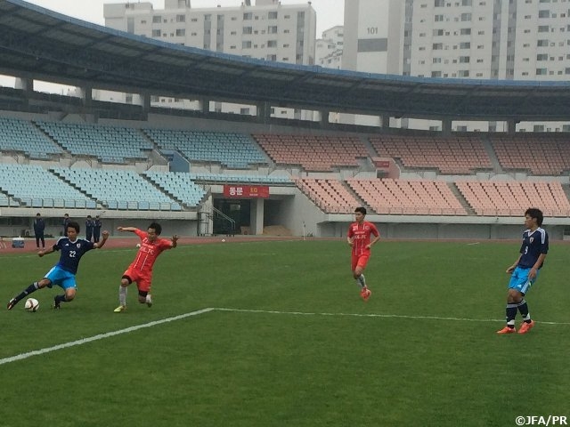 前半、互いに得点のチャンスを作るもゴールは決まらず0-0で終えます。後半開始早々の50分、髙木彰人選手がドリブルで時間を作り、右サイドをオーバーラップして走りこんできだ柳貴博選手にパスを出し、柳選手がゴール前の相手DFとGKの間に絶妙なクロスボールを入れると、このボールを走りこんできた邦本宜裕選手が冷静にシュートを決めて日本が先制します。しかし、63分に日本の右サイドを攻撃され、最後はペナルティーエリア付近から豪快なミドルシュートが打たれ同点に追いつかれてしまいます。それでも日本は再びリードを奪おうと相手陣内でボールを奪う回数を増やしゴールに攻めこむと、失点からわずか4分後の67分、長沼洋一選手からパスを受けた柳選手が再度右サイドを突破。ゴール前のニアサイドに速くて弾道の低いクロスボールを入れると、相手GKが触る前に一美和成選手が逸速く反応しシュートを決めて日本が再びリードします。その後も日本が攻撃を続け、試合を優位に進めますが追加点は奪えず試合終了。日本は韓国遠征第1戦目の練習試合を勝利で終えました。