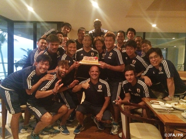 夕食時には、チーム最年長の牧野真二選手の誕生日をみんなで祝いました。