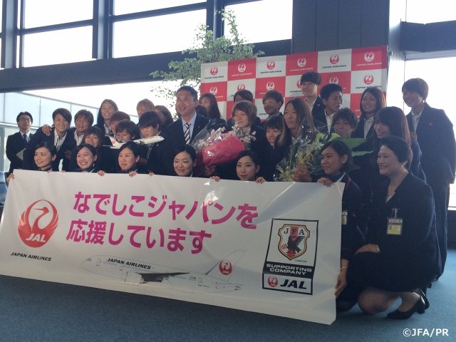 チームは午後に成田空港へと移動。出発セレモニーでは日本代表サポーティングカンパニーの日本航空より佐々木監督、大儀見選手が花束を、宮間選手が機体のモデルをいただき、大会への決意をあらたにしました。