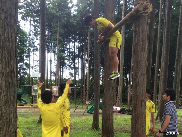 午後は、チームの団結力を高めるために、ASE(Action Socialization Experience:社会性を育成するための活動体験)という野外のキャンプ活動に挑戦しました。選手たちは、このトレーニングの中でさまざまなゲームやプログラムを行い、その中で与えられた課題をクリアしなければなりません。そのためには、選手どうしがコミュニケーションを図り、協力しながら目標に向かう必要があります。選手たちは終始リラックスした表情で、互いに声をかけながら与えられた課題をクリア。笑いの絶えないトレーニングの中で、大会に向けての状況判断力とチームワークを高めました。