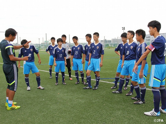 本日は初戦のU-15カンボジア代表戦に臨むべく、神戸弘陵学園高校と35分ハーフの練習試合を行いました。日本は試合序盤、緊張からか神戸弘陵学園高校の攻撃に圧倒されてしまいます。開始2分に左サイドから崩され、1対1を決められてしまい失点します。その後すぐに石井快征選手が惜しいシュートを放ちますが、決めきれません。徐々にリズムを掴みつつもパスの精度が低く、攻守にアグレッシブな神戸弘陵学園高校に26分、30分と続けて失点し0-3で前半を終了します。ハーフタイムには森山佳郎監督から激しい檄が飛び、後半は前半とは異なり積極的に攻め続けます。岩井龍翔司選手のクロスから何度もチャンスを作り、栗原イブラヒムジュニア選手も惜しいシュートを放ちます。守備面でも体を張ったシュートブロックを何度も見せ、決定機を許しません。しかし、U-15日本代表は決定的なチャンスを活かすことができず、0-3で試合を終えました。
