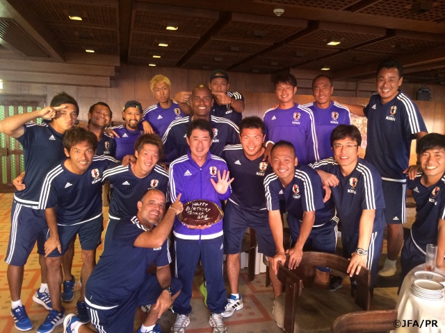 夕食後には、アスレティックトレーナーの田中祐介さん(三宅スポーツマッサージ)の記念すべき、50回目の誕生日をチームみんなでお祝いしました。田中さんは、2007年からビーチサッカー日本代表に帯同し、今回のビーチサッカーワールドカップが自身6回目の大会となります。毎晩体のケアを田中さんにして頂いている選手たちからは、一発芸のプレゼント(?) が送られ、トレーニング外では終始リラックスした状態で2日目を終えました。