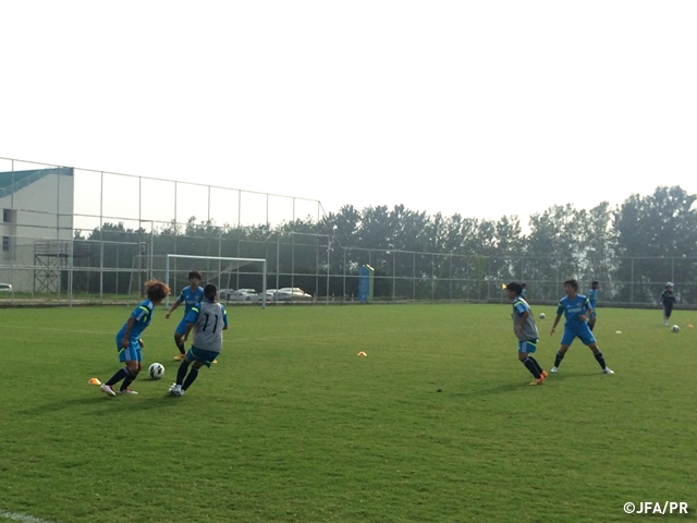 AFC U-19女子選手権中国2015に出場するため日本を出発したU-19日本女子代表は14日夜、開催地の中国・南京に到着しました。翌15日の午前中は、前日の移動を考慮し、体を慣らすコンディショニングトレーニングを中心としたメニューに取り組みました。午後は、3対3+GK、4対4+GKのフォーメーション練習で、ゴール前での攻撃・守備を確認し、その後はゲーム形式のトレーニングでこの日のメニューを終えました。