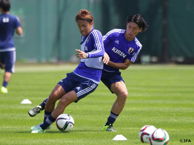 一方、交代出場したFW宇佐美貴史選手ら3選手を含めた控えの選手たちは、パス回しなどで体をほぐした後に、ヴァイッド・ハリルホジッチ監督が鋭い視線を送る中、5対5でパス回しを行い、狭いエリアで速いテンポのパスを入念に確認。さらに、フィールドの3分の1ほどの狭いエリアで、GKを配してタッチ数を制限した実戦形式に取り組みました。