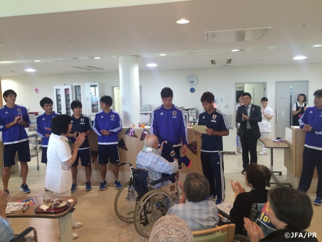 午後は、佐賀市内にある佐賀県医療センター好生館を慰問しました。これは、手倉森監督の希望で行われたもので、サガン鳥栖の協力を得て実現しました。選手は2グループにわかれて小児病棟と緩和ケア病棟をそれぞれ訪れ、サイン入りユニフォームを贈呈したり、一緒に写真を撮ったりと入院中の方々と楽しいひと時を過ごしました。キャプテンの遠藤航選手は、「自分たちが頑張っている姿や結果を残すことによって、今日会った子供たち、そして、全国で病気を患っている子供たちに少しでも勇気や感動を与えられるようなプレーをしなければいけない」と語っていました。
