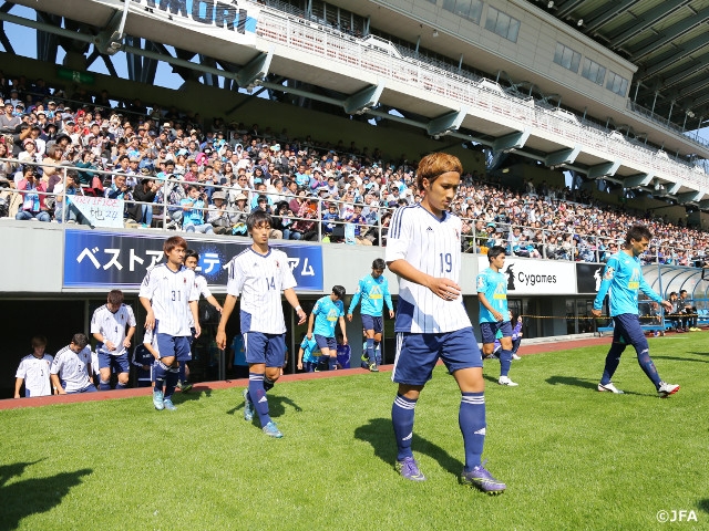 4-4-2の布陣で臨んだU-22日本代表候補は序盤から、FWの金森健志選手、荒野拓馬選手を中心に前線から果敢にチェイシングし、球際で激しく戦いセカンドボールを奪い、ゲームの主導権を握ります。15分、CKからMF原川力選手があげたボールを中央でDF奈良竜樹選手が頭で合わせ待望の先制点を奪います。続く24分にも全く同じ形で原川選手のCKを奈良選手が頭で合わせ追加点をあげます。その後もワンタッチパス、3人・4人と連動したコンビネーションにより次々チャンスを生み出します。前半終了間際の45分、相手ペナルティエリア内でファウルを貰うとFW中島翔哉選手がPKを落ち着いて決め3点目。直後の45+1分、パスカットから前線に飛び出したFW浅野拓磨選手が相手GKとの1対1を冷静にかわし4点目を決め、前半を4-0で折り返します。