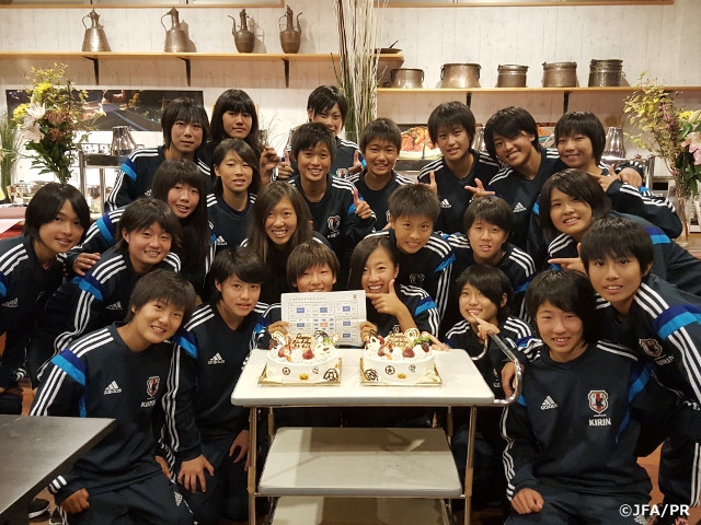 夕食後は、この日15歳を迎えた菅野奏音選手の誕生日を祝いました。菅野選手は、「(15歳になり)今まで以上にチームの中心としてプレーできるようになりたいです。まずは、AFC選手権で日本の勝利に貢献できるようになりたいです。」と決意を口にしました。
