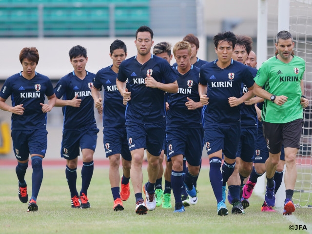 練習は、曇天ながらも30℃を超える気温と高い湿度の中でスタート。所属クラブの試合の都合で合流の遅れているMF香川真司選手(ボルシア・ドルトムント)とDF長友佑都選手(インテル・ミラノ)を除いた21選手が集まり、冒頭にヴァイッド・ハリルホジッチ監督から「今季最後の試合になる。来シーズンへ勢いを持って行けるような試合をして、しっかり勝とう」という話がありました。