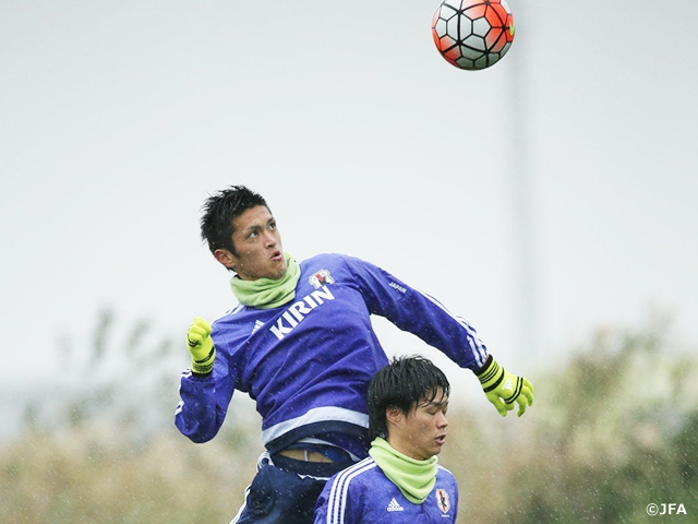昨日の22℃という温かい気候から一転、気温8℃という極寒の中で午後の練習が始まりました。パス&コントロールからフォーメーション、10対10のゲーム形式の練習を実施。明日の試合に向けて、そして、1月の最終予選に向けて、球際で激しく競り合うなど気迫のこもったプレーを見せてキャンプ最後のトレーニングを終了しました。
