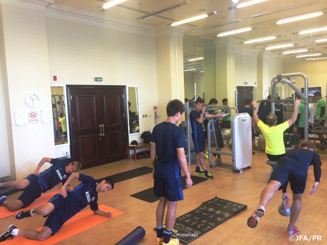 1月5日午前はホテルでのウェイトトレーニングで選手たちは汗を流しました。3グループに分かれて、大会を通したコンディショニングのため筋肉に刺激を与えます。