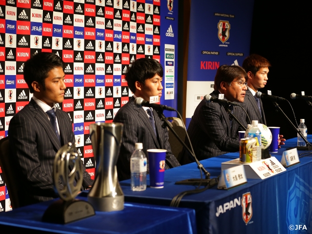 この後、空港内の施設で帰国記者会見を実施。手倉森誠監督、キャプテンの遠藤航選手、副キャプテンの岩波拓也選手と大島僚太選手が登壇しました。