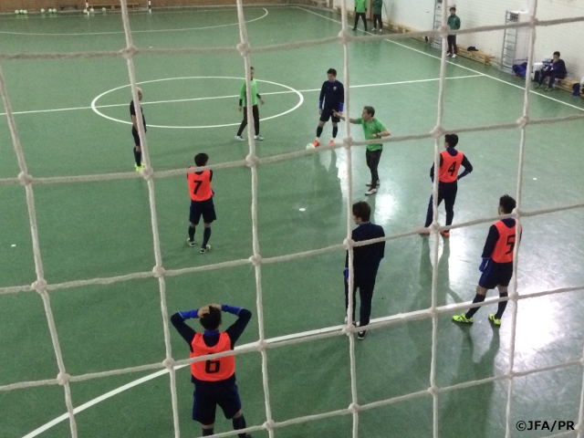 AFCフットサル選手権に臨むフットサル日本代表は10日、初戦のカタール戦(2月11日)に向けて現地時間17:00(日本時間:21:00)からトレーニングを行いました。トレーニング開始前にはカタール戦に向けたビデオミーティングを行い、チーム全体で相手のストロングポイント・ウィークポイントの共有を図りました。本日のトレーニングメニューはプレスの回避やパワープレーからの攻撃、セットプレーの最終確認と短い時間ながらも集中した内容となりました。監督だけではなく、選手間でもプレーの意図を確認するなどアグレッシブかつ集中した時間が過ぎていきました。