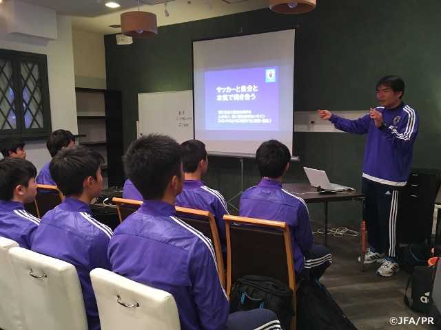 夜には池川直志ドクターから食事や水分補給の摂取方法について学び、佐藤洋平GKコーチからAFC U-23選手権 カタール 2016での活動の報告がありました。選手たちは皆、U-23日本代表の活躍した映像を食い入るように見ていました。明日は午前・午後と2部トレーニングを予定しています。