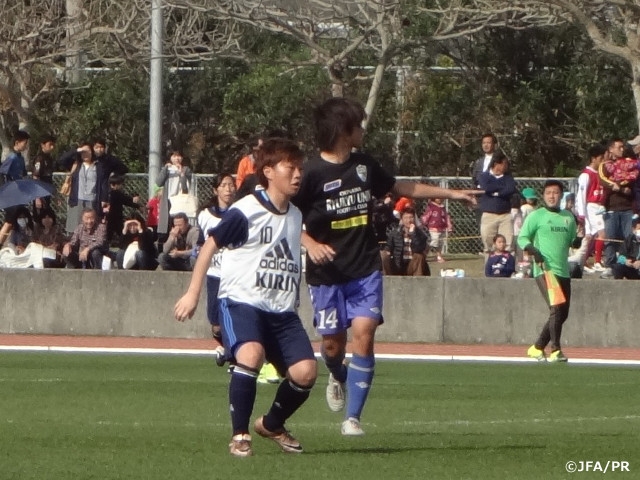 男子大学生を相手に、守備を意識しながらゲーム形式のメニューを繰り返し、最後に紅白戦を20分ほど実施しました。狙いは、フィジカルが強くスピードがある相手に対し、様々な局面での対応方法を確認すること。「こういうところで、大学生を相手に練習できるのはありがたいこと。やるべきことを理解し、チーム全員で共通意識を持ちながらプレーできていると思う」とMF中島依美選手はコメントしています。プレーを止めながら指示を飛ばし続けていた佐々木則夫監督も、「いいチャレンジを見せてくれた」と最後に選手たちに声をかけていました。