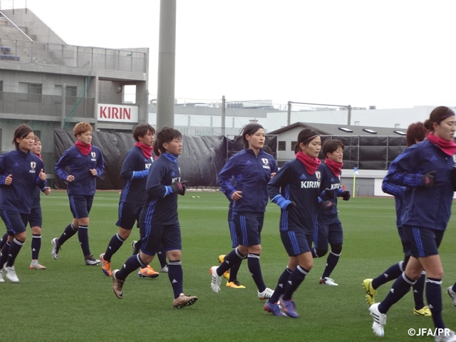 1月下旬の石垣島キャンプ、2月中旬の沖縄キャンプを経て、選手25名で直前キャンプに臨んでいます。所属クラブでの試合出場状況や連戦に向けてのコンディションなどを考慮してMF宇津木瑠美選手(HSCモンペリエHSC)、MF安藤梢選手(SGSエッセン)の招集が見送られているため、海外組はDF熊谷紗希選手、FW大儀見優季選手、FW岩渕真奈選手の3名。国内組を含めた各選手の最終的な状態を把握したうえで、最終予選の登録メンバー20名が決まります。